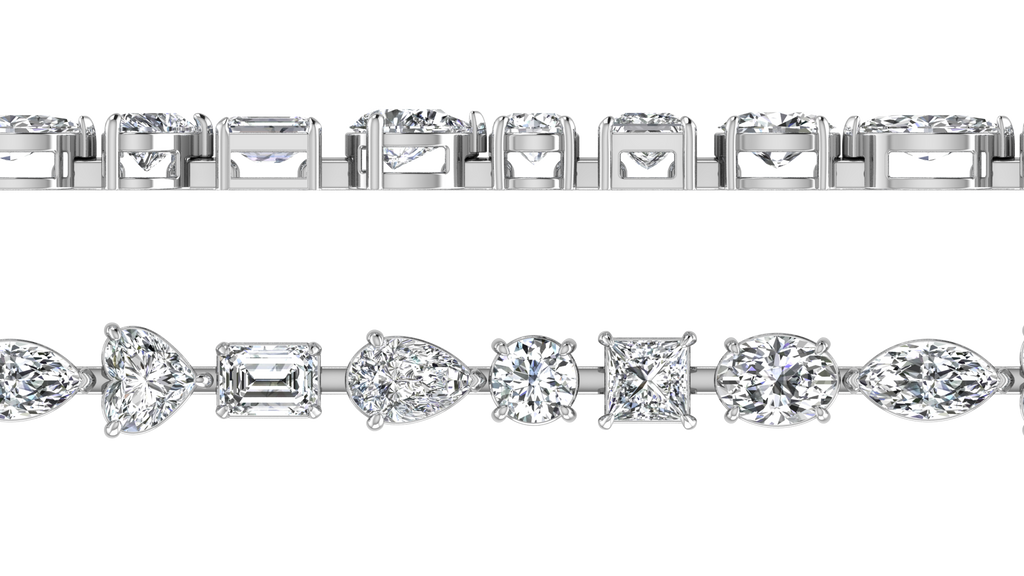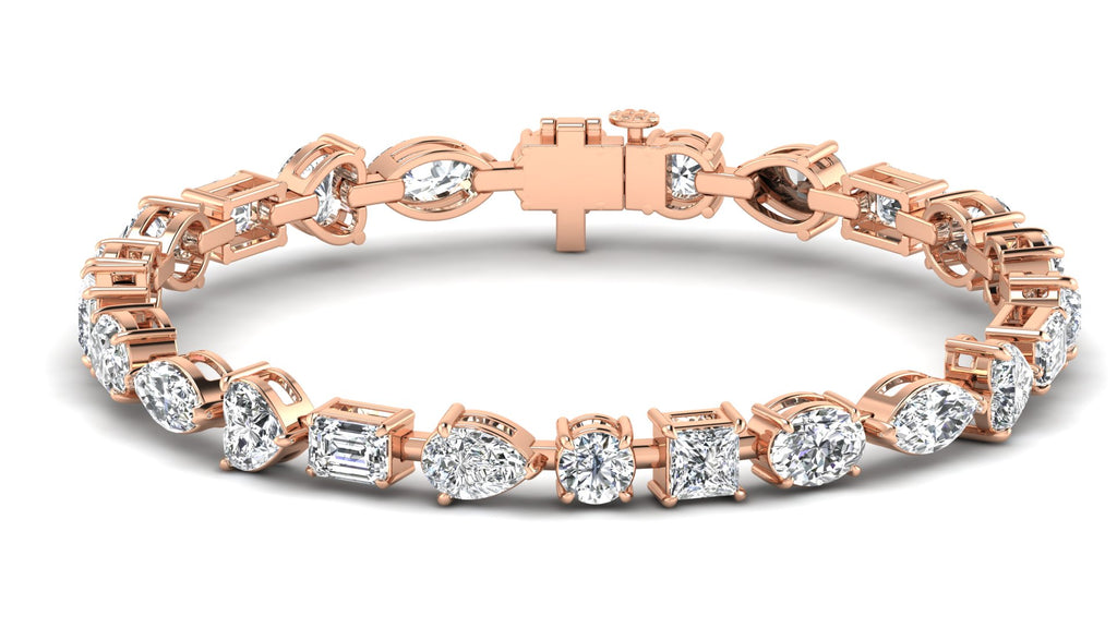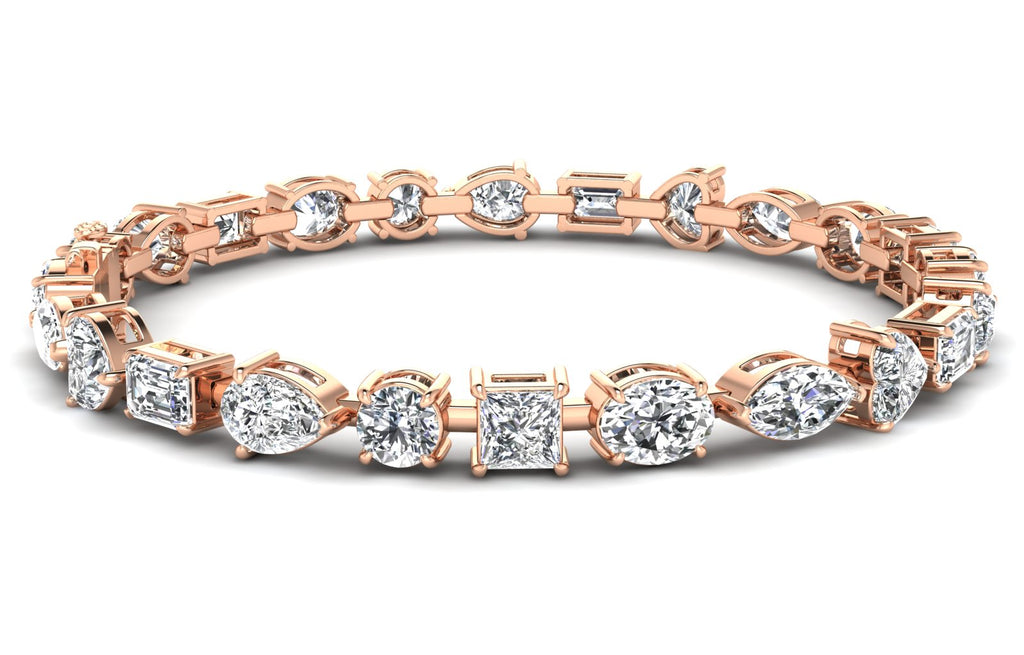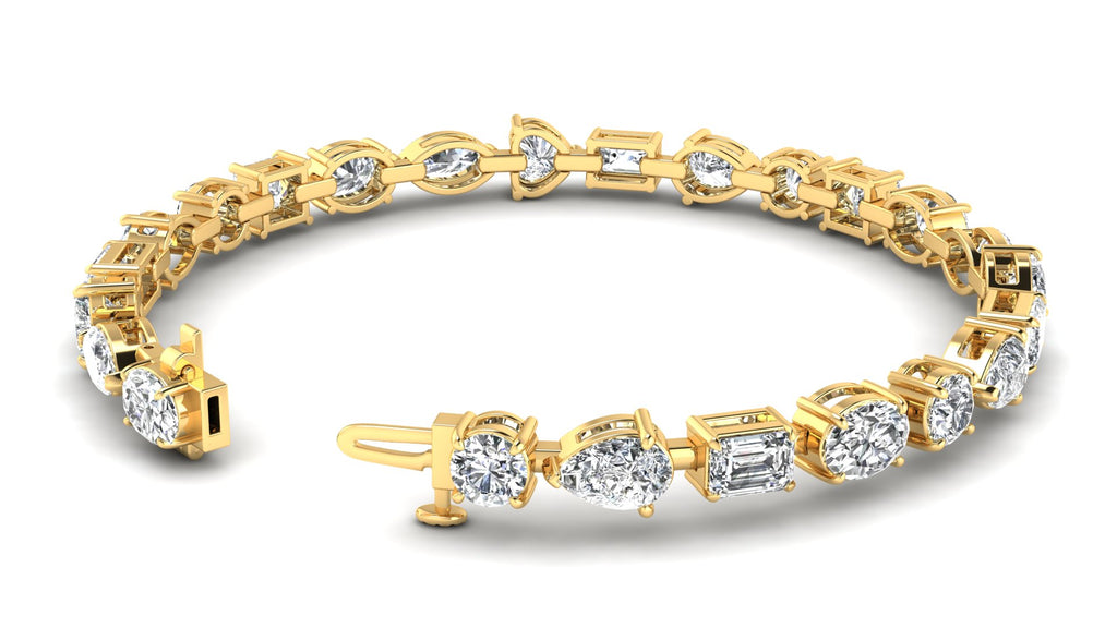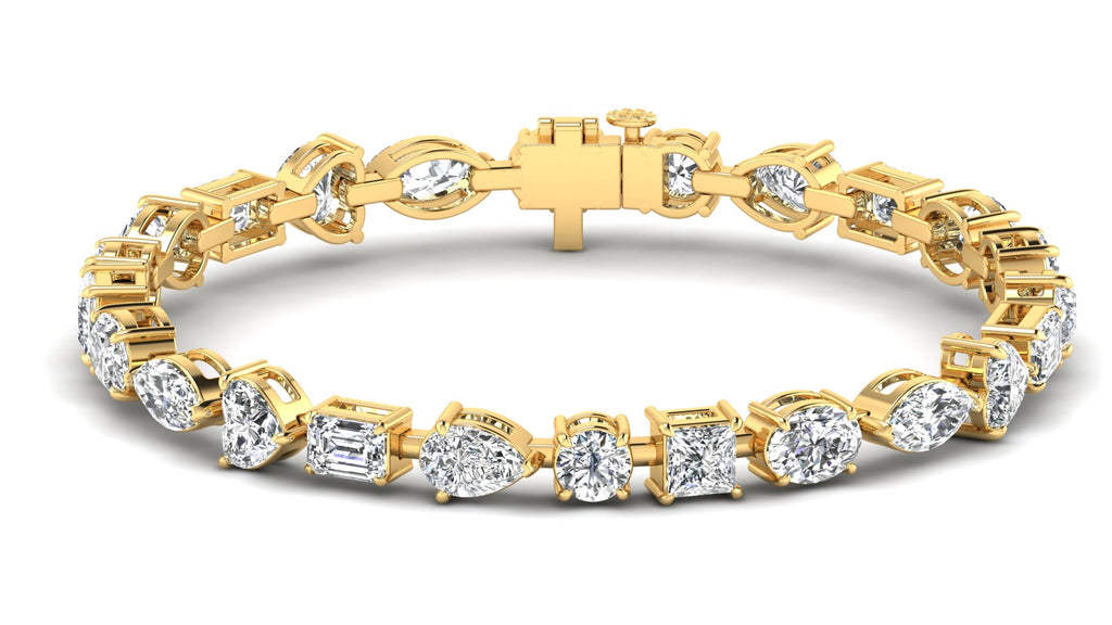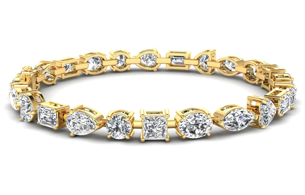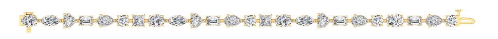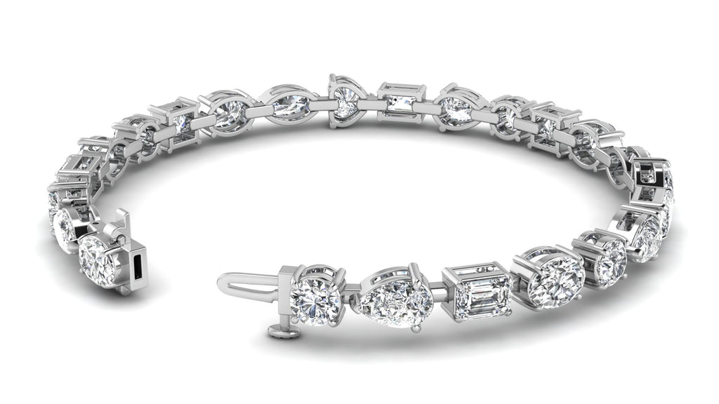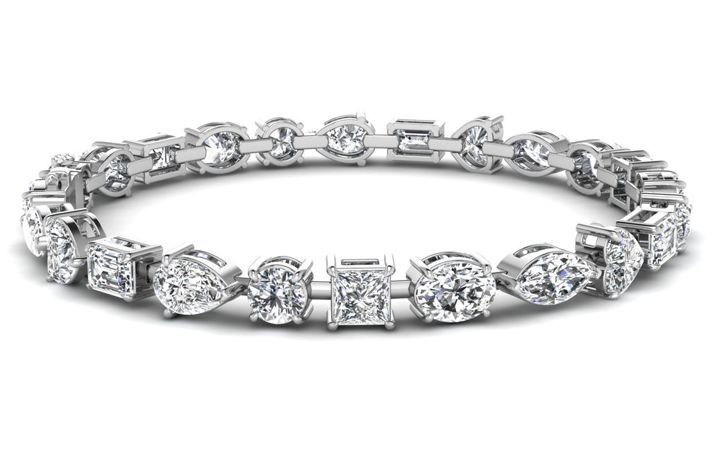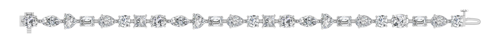 Featuring a stunning 19.38 ct. combination of oval, marquise, pear, emerald, round, and princess shaped white diamonds, graded a fabulous E - VS1 quality, this bracelet exudes elegance and sophistication.