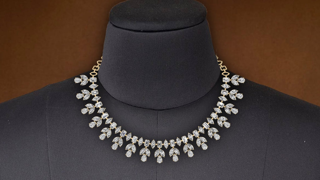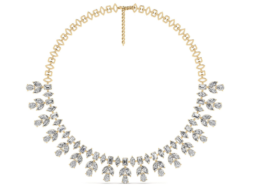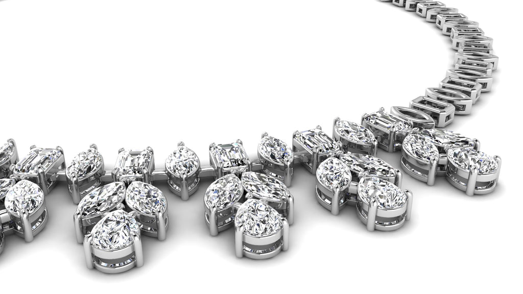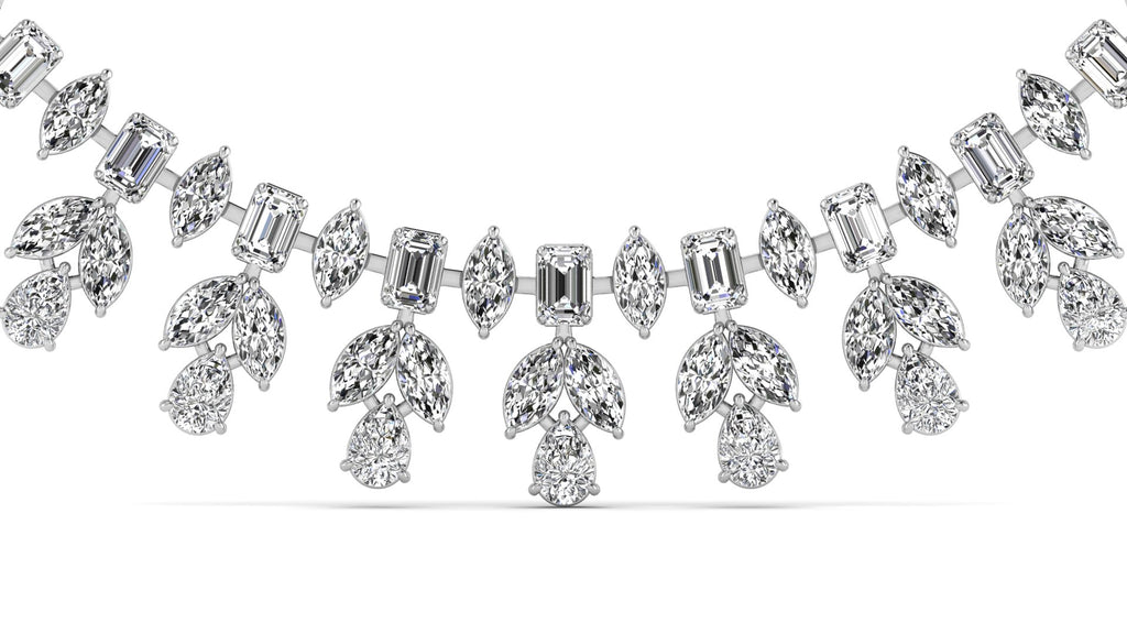 Indulge in luxury with our Fleur de Lys Necklace, adorned with a stunning 41.93 ct. bouquet of E - VS1 white diamonds in pear, emerald, and marquise shapes.